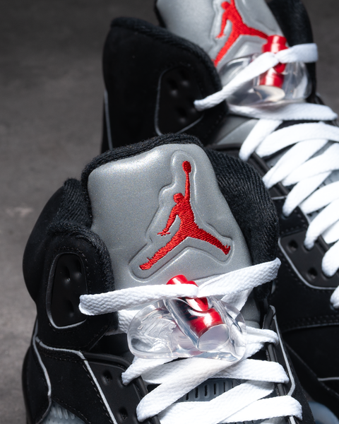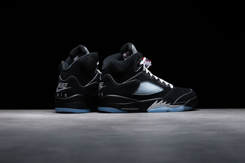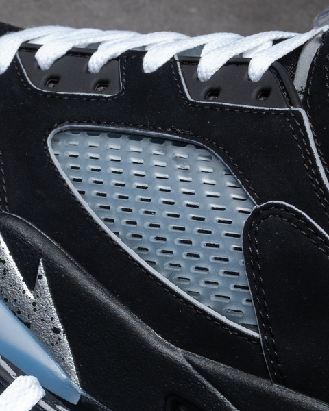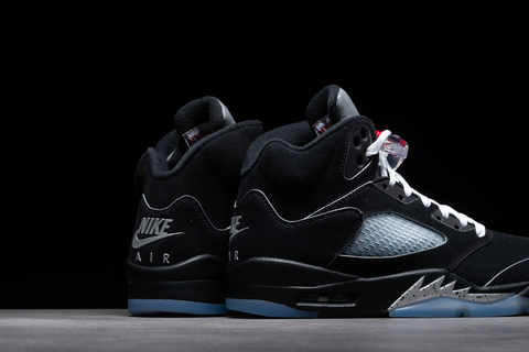 THE AIR JORDAN 5 “BLACK METALLIC” IS BACK AS PART OF JORDAN BRAND’S “REIMAGINED” LINEUP, PAYING HOMAGE TO ITS 1990 ORIGINS WITH SUBTLE UPDATES. FEATURING A BLACK NUBUCK UPPER, METALLIC SILVER ACCENTS ON THE 3M REFLECTIVE TONGUE AND SHARK TEETH, AND FIRE-RED DETAILING ON THE JUMPMAN, THIS RELEASE BALANCES HERITAGE WITH NEW TOUCHES LIKE 3M PIPING AND WHITE LACES INSPIRED BY MJ’S PLAYER EXCLUSIVES.