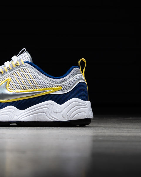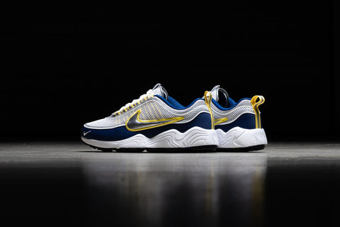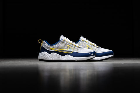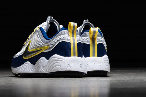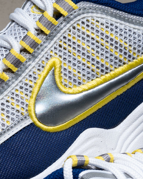 The Nike Air Zoom Spiridon SP returns in a clean White/Metallic Silver with navy and yellow accents. First released in 1997, it features breathable mesh, reflective details, and Zoom Air cushioning for a lightweight, responsive feel. A bold Swoosh outlined in yellow completes the look.