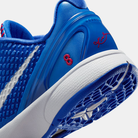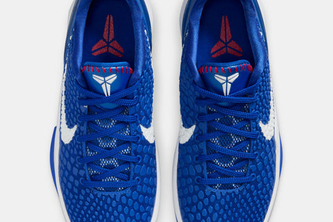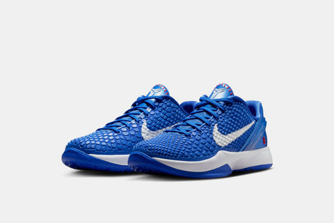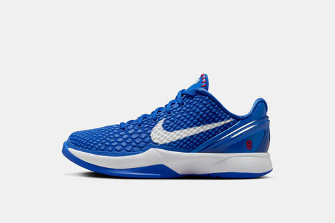 The Nike Kobe 6 Protro ‘Dodgers’ pays tribute to Kobe’s storied connection with the LA franchise. Featuring a bold Game Royal upper with snakeskin-textured scales and red stitching inspired by classic baseball details, the look is finished with a white Swoosh, Kobe’s number 8 on the heel, and Protro cushioning underfoot. A perfect blend of performance and heritage—rooted in Los Angeles.