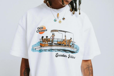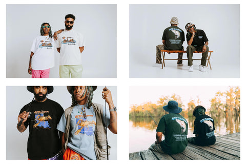 We’ve teamed up with OCD Cleanersto collaborate on a capsule collection of t-shirts and a limited number of reversible upcycled mesh basketball shorts made from t-shirts sourced from our friends, family, and local thrift shops.⁠⁠⁠⁠ This collaboration is one of a kind with the founder of OCD Cleaners, Isaiah having roots in Lafayette, LA the birthplace of Sneaker Politics, and is a full-circle moment for both brands. The capsule’s inspiration draws from elements that are unique to Louisiana’s richly diverse culture. Fishing, eating crawfish, and partying on a boat are all parts of growing up in Lafayette.⁠⁠