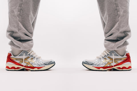 Rooted in ’80s propaganda, the Politics ASICS GEL-KAYANO™ 14 pairs crisp white mesh with silver overlays and pure gold Tiger Stripes on both the medial and lateral sides of the shoe. Red accents complement the design, on the tongue, tweed inspired insole, and the GEL unit, while an aged cream EVA midsole meets a black and red outsole.