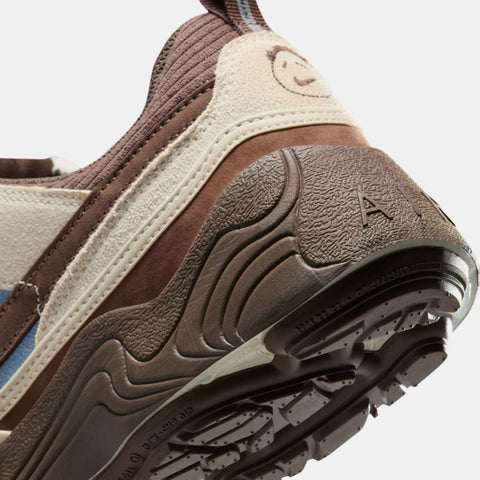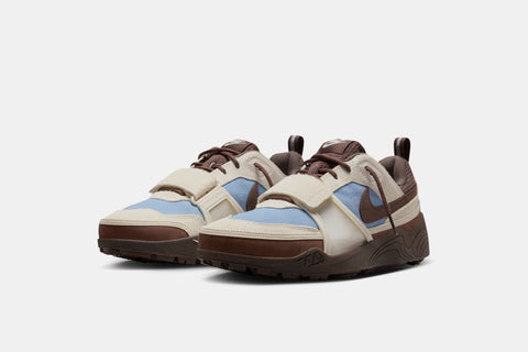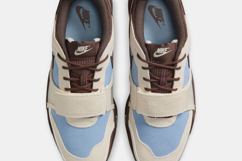 The Travis Scott x Nike Zoom Field Jaxx in Leche Blue/Baroque Brown blends retro turf DNA with Cactus Jack’s signature design language. Featuring a layered upper with suede, mesh, and molded paneling, the silhouette nods to ‘90s performance trainers while introducing a rugged, trail-ready edge. Hits of Leche Blue contrast against rich brown tones, while co-branded details and an extended heel pull tab round out the look. Built for lifestyle, grounded in sport.